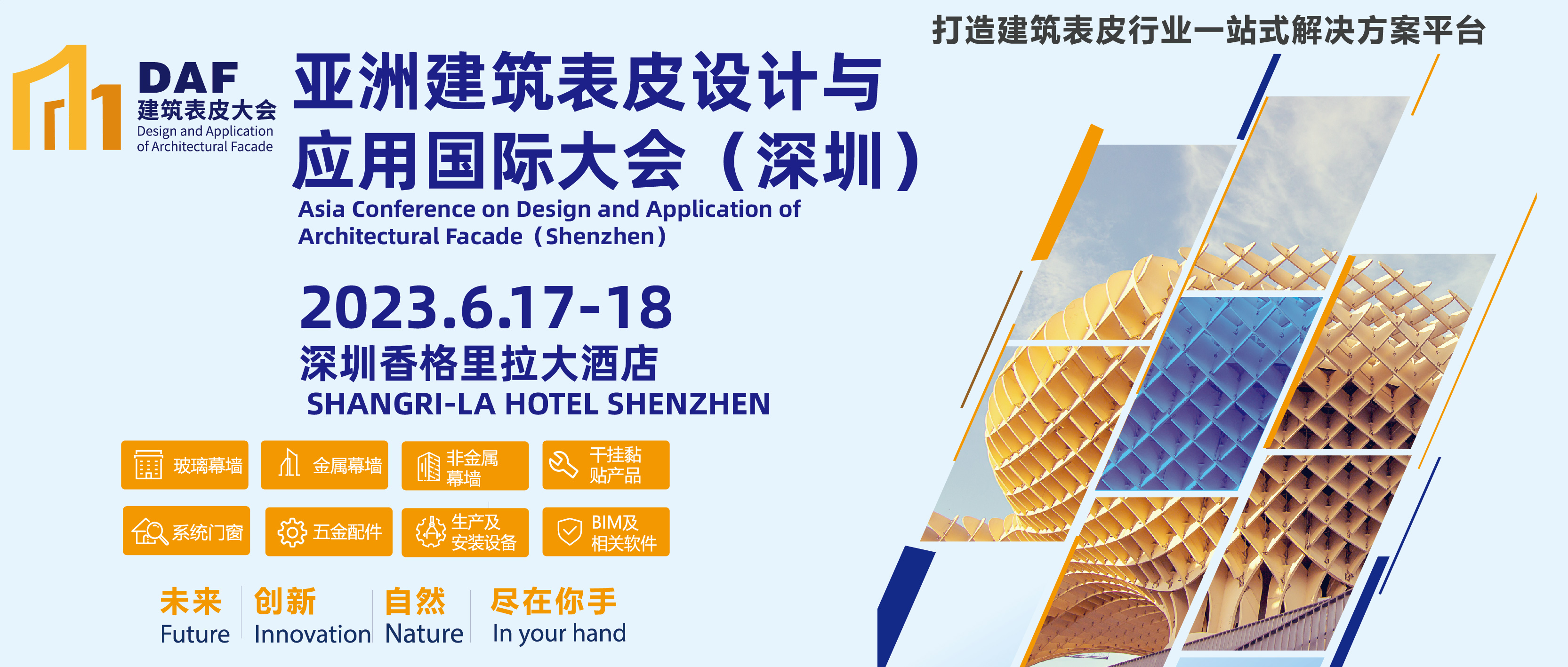 9.19-212023上海DAF建筑表皮大會時間:2023年9月19-21日地點:上海新國際博覽中心本次大會以“綠色,低碳,可持續(xù)”為主題,將分別從建筑數(shù)字化,城市更新,綠色低碳,可持續(xù)發(fā)展這四個角度出發(fā),同樣從建筑設(shè)計、幕墻深化和幕墻施工...